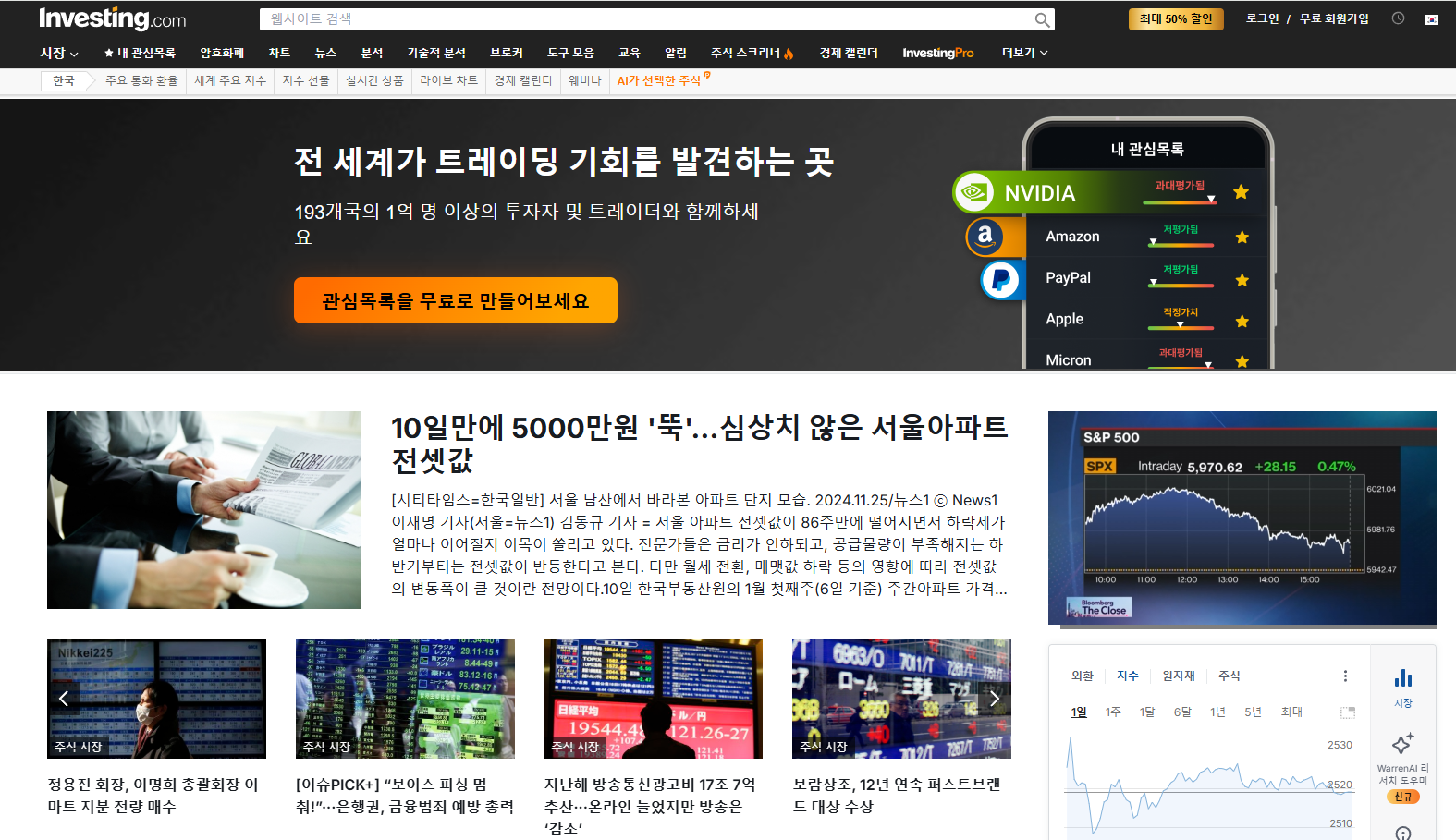 인베스팅닷컴은 전 세계 금융 시장의 실시간 데이터를 제공하는 글로벌 금융 포털입니다. 특히 미국 증시 정보에 있어서 다음과 같은 장점을 제공합니다: